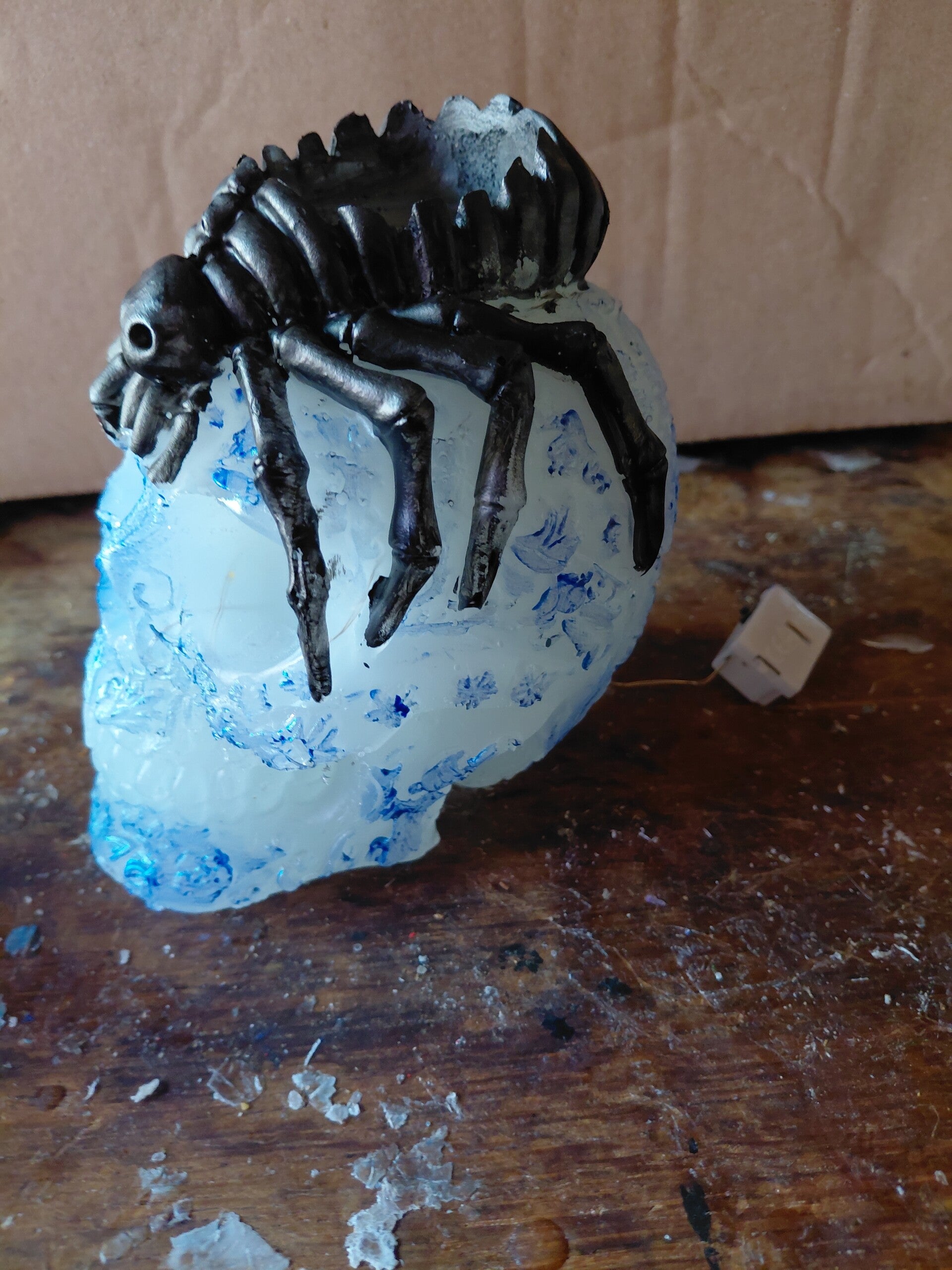 lampje skull met spin, spin is ook theelichthouder, wit/blauw